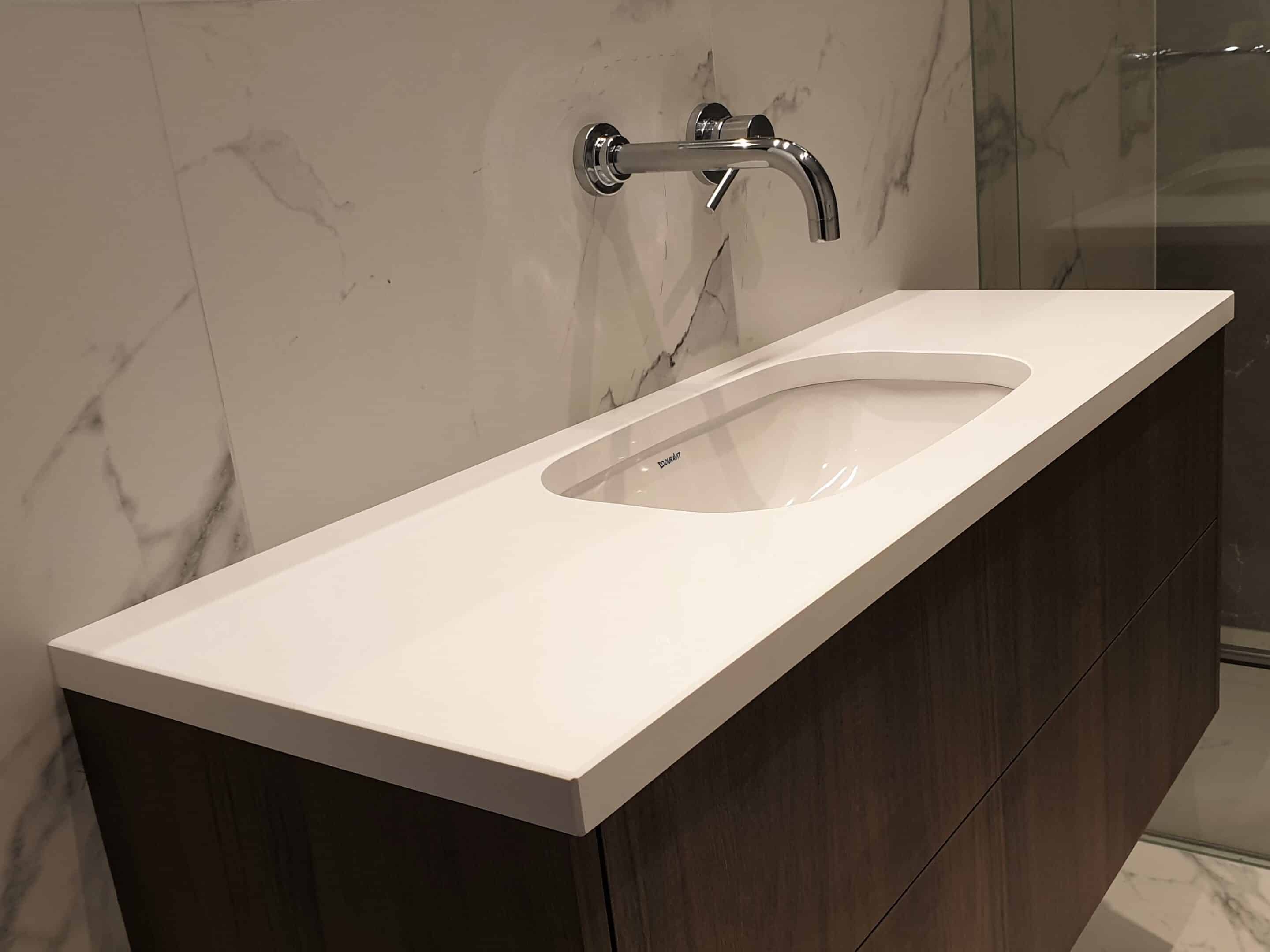 Grupa: biały blat | blat łazienkowy | blat z konglomeratu | crystal absolute white | łazienka | technistone | umywalka podwieszana